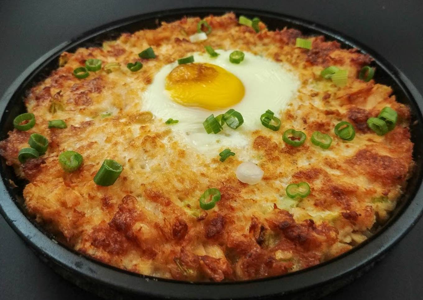 - In a large bowl, mix all the ingredients, except for the egg. Then, transfer the mixture to the bakeware. Lightly press the center of the mixture with a spoon and create a crater.